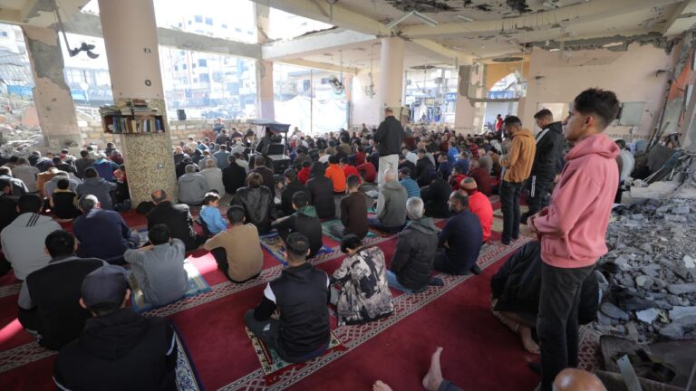 Filistinliler, İsrail’in Gazze’de yıktığı Faruk Camisi’nin yıkıntıları arasında cuma namazını kıldı. 12/06/2024